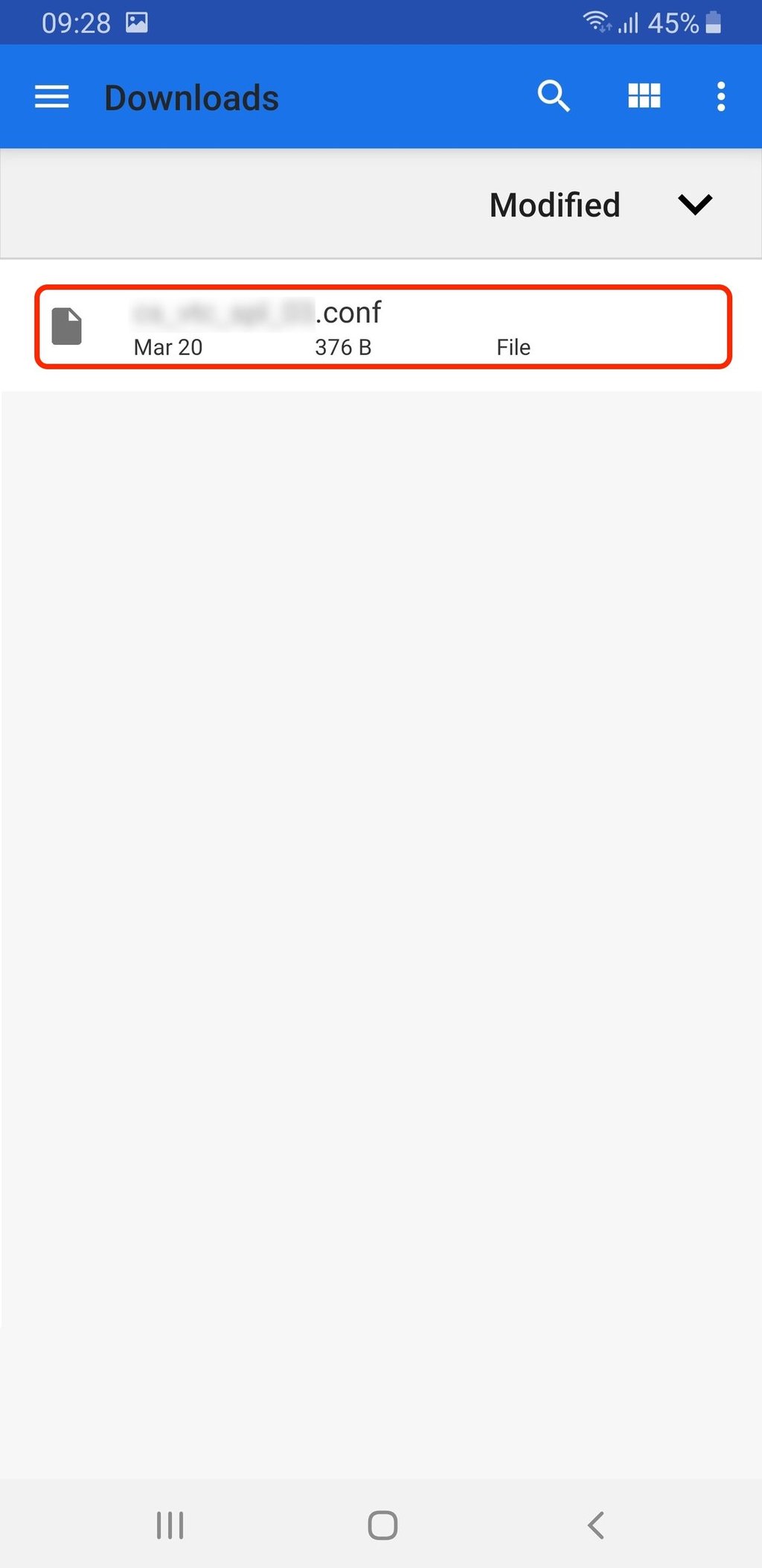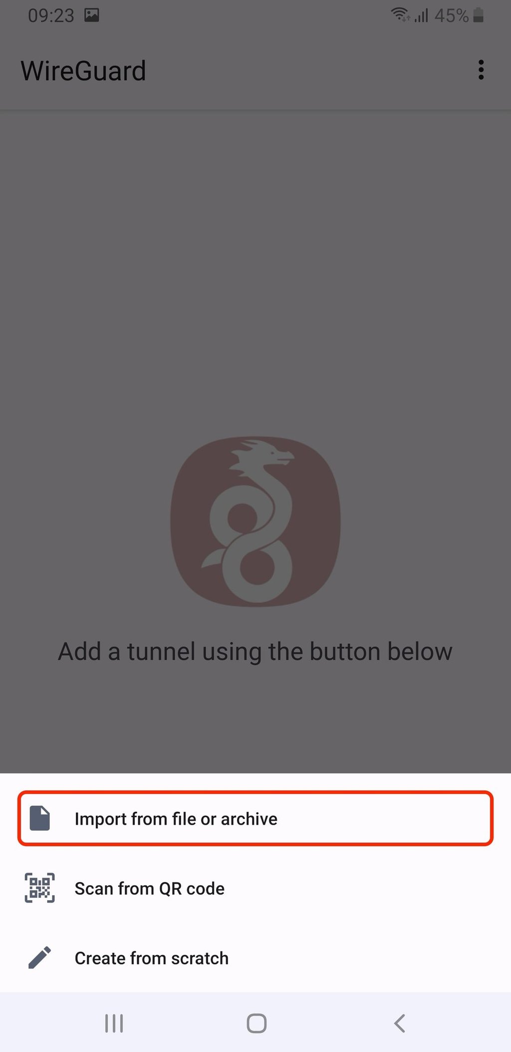 4. Pasirinkite WireGuard konfigūracijos rinkmeną, kurią jums perdavė jūsų IT sistemų administratorius;