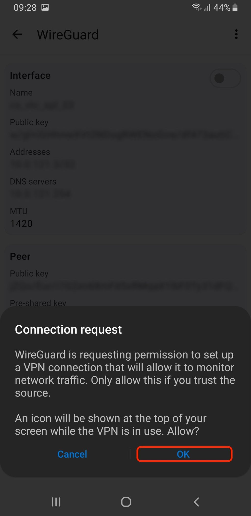 7. Leiskite WireGuard pridėti naują VPN konfigūraciją, jūsų mobiliajame įrenginyje, paspausdami mygtuką OK / Gerai;
