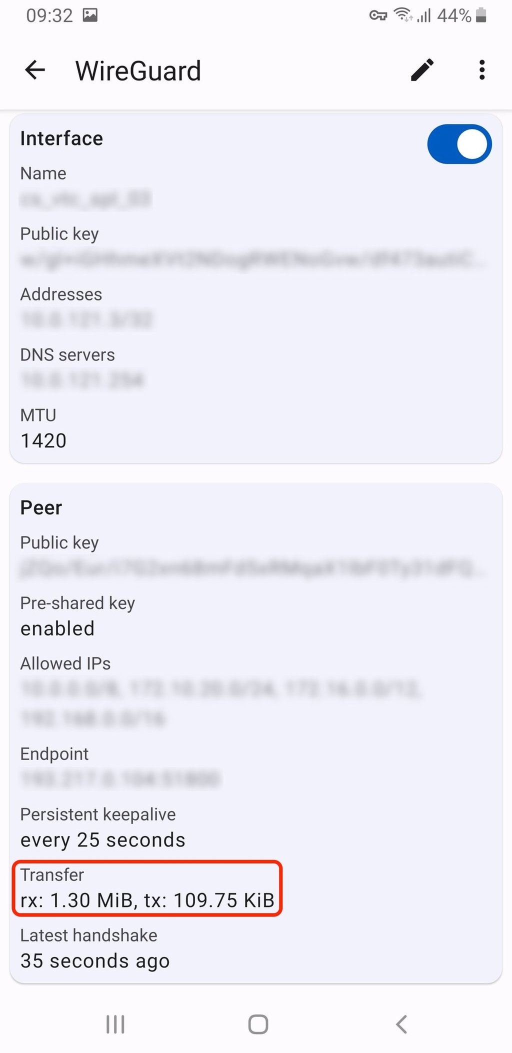 • WireGuard VPN tunelio informacijos lange galite matyti kiek duomenų gavote / išsiuntėte per VPN tunelį;