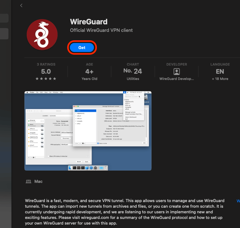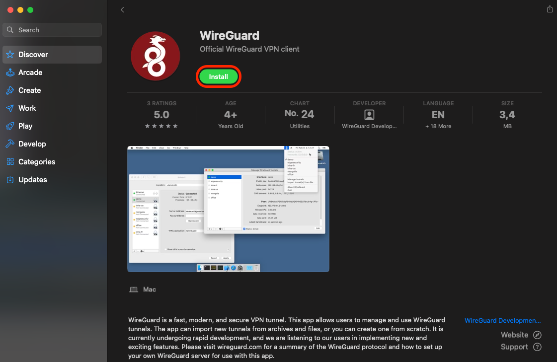 1. Įsidiekite oficialią WireGuard programėlę. Paspauskite Get / Gauti -> Install / Įdiegti;