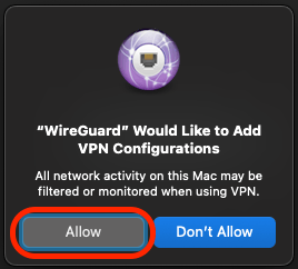 6. Leiskite WireGuard pridėti naują VPN konfigūraciją jūsų Apple įrenginyje paspausdami mygtuką Allow / Leisti;