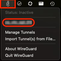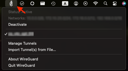 • Taip pat aktyvuoti WireGuard VPN tunelį galite per meniu juostą (ekrano viršuje). Viršutiniame dešiniajame ekrano kampe paspauskite ant WireGuard piktogramos, tada ant VPN tunelio pavadinimo;