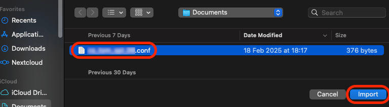 5. Pasirinkite WireGuard konfigūracijos rinkmeną, kurią jums perdavė jūsų IT sistemų administratorius, ir paspauskite mygtuką Import / Importuoti;