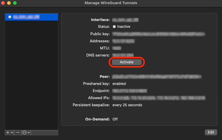 NEPAMIRŠKITE! Nors ir galite tą pačią WireGuard konfigūracijos rinkmeną pernaudoti kituose įrenginiuose, vienu metu gali būti aktyvus tik vienas VPN tunelis per vieną WireGuard konfigūracijos rinkmeną. Jei ketinate naudoti WireGuard VPN keliuose įrenginiuose, jums reikės, arba užtikrinti kad vienu metu tik vienas įrenginys naudojasi VPN tuneliu, arba kreiptis į IT sistemų administratorių, kad sukurtų papildomas WireGuard konfigūracijos rinkmenas.