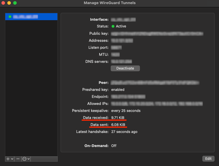 • WireGuard programėlėje galite matyti kiek duomenų gavote / išsiuntėte per VPN tunelį;